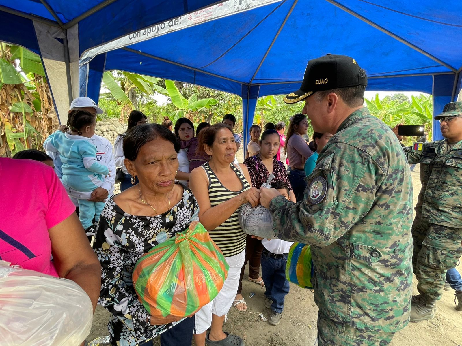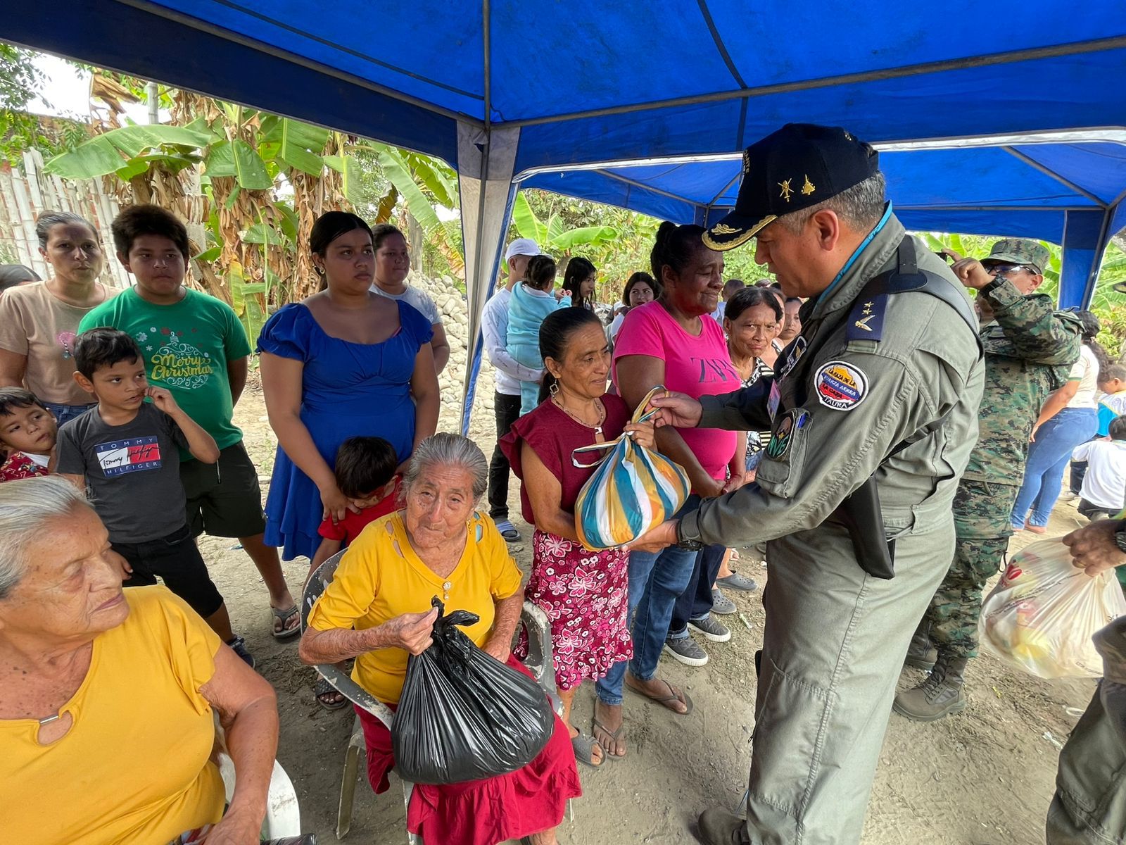 Más allá del festejo infantil, la intervención tuvo un componente de apoyo social directo para los adultos del sector. En un gesto de profunda solidaridad, se realizó la entrega de kits de víveres y prendas de vestir a las madres de familia y mujeres de la comunidad. Esta acción busca mitigar las necesidades básicas de los hogares en situación de vulnerabilidad, reafirmando que la misión de la FAE trasciende la vigilancia del espacio aéreo para convertirse en un soporte tangible en tierra.