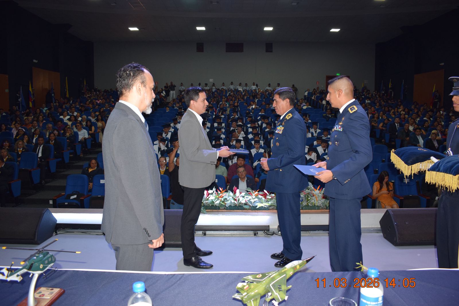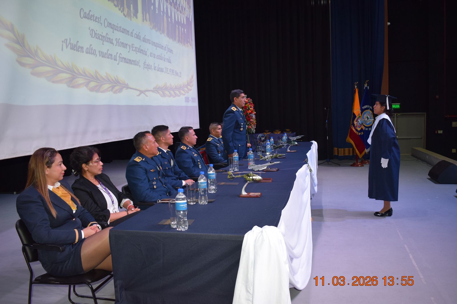 El acto fue presidido por el señor Brigadier General Nilo Estrada Caicedo, Comandante del Comando de Educación y Doctrina Militar Aeroespacial (COED), cuya presencia subrayó la importancia que la Fuerza Aérea Ecuatoriana otorga a la formación académica de excelencia. Durante su intervención, el General Estrada destacó que la educación militar no solo entrega conocimientos científicos, sino que forja el carácter a través de valores fundamentales.