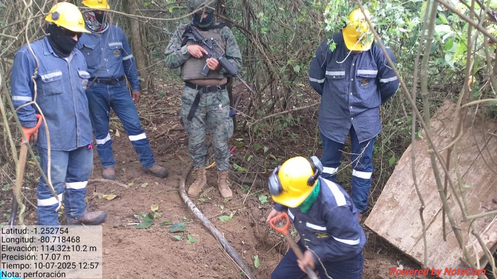 Ambato.- Durante una operación de seguridad hidrocarburífera en el sector Montalvo, personal militar de la Fuerza Aérea Ecuatoriana, en coordinación con inteligencia militar, identificó una perforación clandestina en la tubería del Sistema de Poliducto Nacional, tramo Quito-Ambato-Riobamba. El hallazgo se produjo durante un patrullaje a pie, cuando los uniformados localizaron una manguera industrial conectada directamente a la tubería, la cual se extendía hacia el interior de una propiedad privada. Entre los elementos encontrados se registraron un acople de aluminio y una manguera de alta presión de aproximadamente 100 metros, los cuales fueron entregados en cadena de custodia a las autoridades competentes para los trámites legales correspondientes. Con esta acción, las Fuerzas Armadas del Ecuador reafirman su compromiso con la protección de los recursos estratégicos del Estado, ejecutando de forma firme y constante operaciones militares para combatir las estructuras delictivas dedicadas a la sustracción ilegal de combustible.